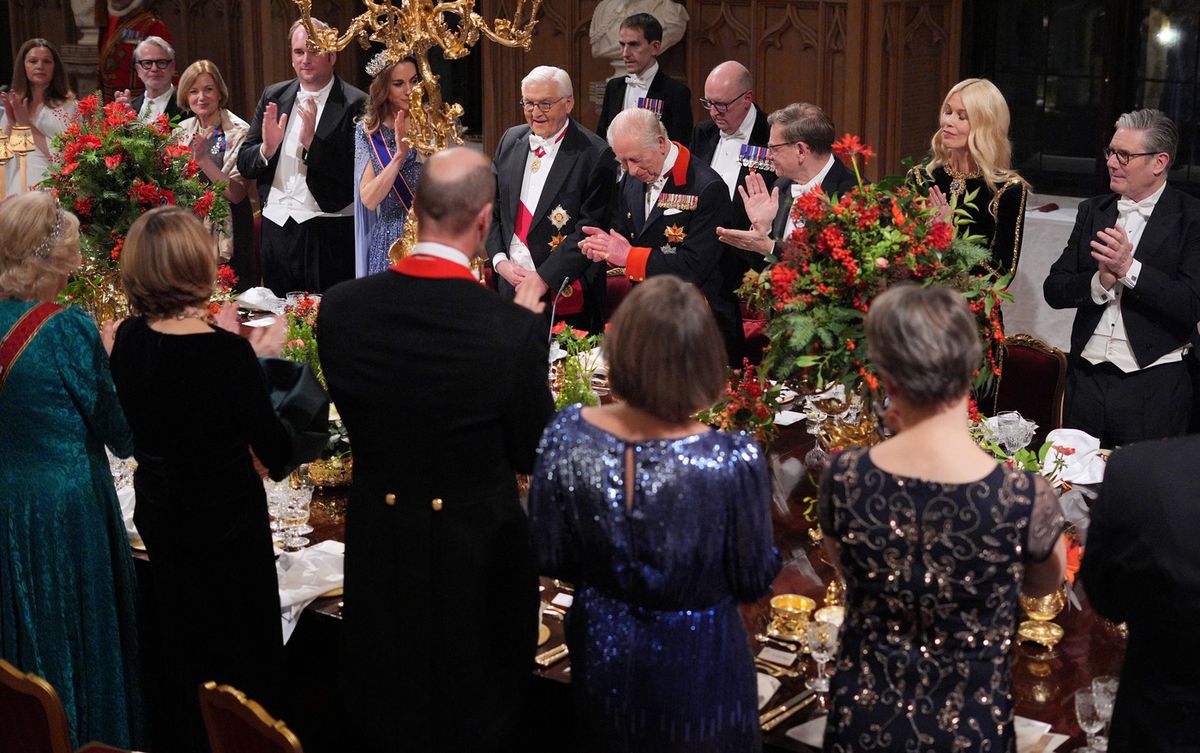 Stredajší večer však vytvoril zaujímavý pohľad priamo v komnatách, kde sa konala pompézna a veľkolepá večera – už vo vianočnej atmosfére a výzdobe. Kráľ Karol III. a kráľovná Kamila hostili nemeckého prezidenta Franka-Waltera Steinmeiera a prvú dámu Elke Büdenbenderovú a v rámci ich štátnej návštevy pozvali aj niekoľko význačných osobností, ktoré ukazujú spojenie Veľkej Británie a Nemecka. Ocitla sa medzi nimi aj niekdajšia supermodelka Claudia Schiffer a jej manžel – filmár Matthew Vaughn,ktorý nosí titul Sir.