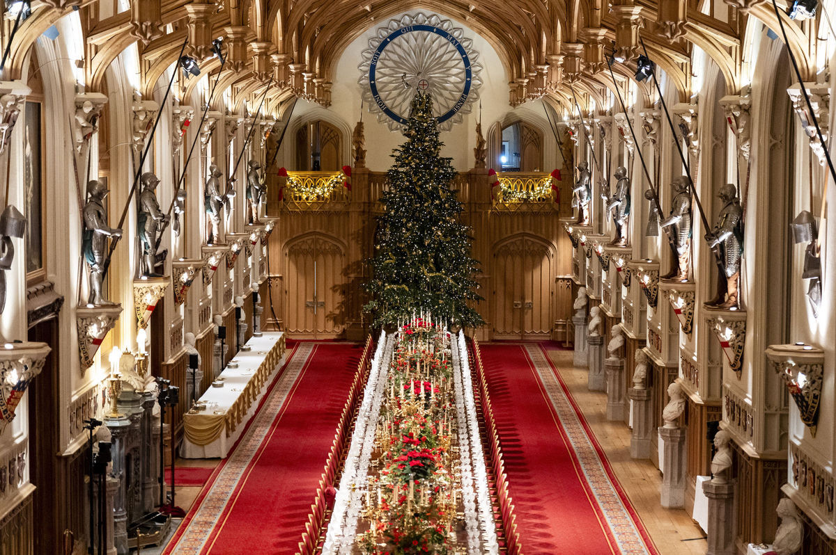 Dominantou v nádhernej sieni s obrovskými klenutými stropmi bola 25-metrov vysoká normandská jedľa, ozdobená 15 000 blikajúcimi svetielkami. Ako informoval portál Hellomagazine, kráľovský personál strávil päť dní prestieraním stola kúskami z Veľkého servisu (Grand Service) z Kráľovskej zbierky. Ide o strieborný pozlátený jedálenský servis z roku 1811, ktorý zahŕňa taniere, polievkové misy, stojany na dezerty a svietniky ovplyvnené gréckym, rímskym, egyptským a orientálnym štýlom.